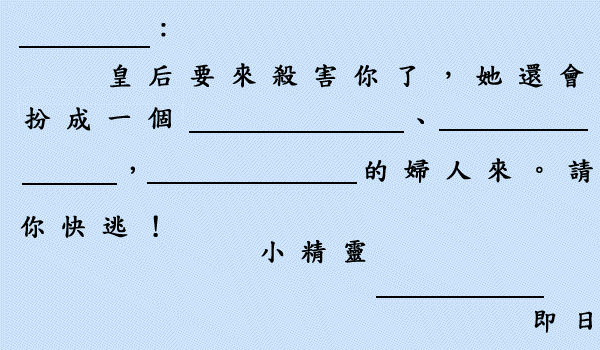 對 小 精 靈 所 講 的 說 話 寫 成 便 條 。 以 下 的 資 料 相 信 一 定 可 以 幫 到 你 。 請 選 出 適 合 的 詞 句 完 成 下 面 的 便 條 吧 ! 小 朋 友 , 加 油 努 力 呀 !